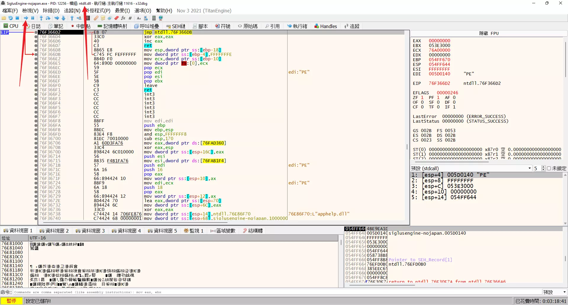 會發現現在 EIP 停在了程序最開始的地方,最頂上顯示了當前正在運行的模組是 ntdll.dll,這表示程序運行還沒真正進入到 Galgame 主程序的領空。