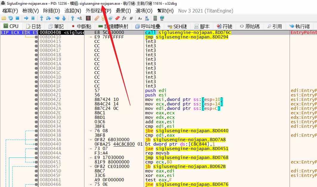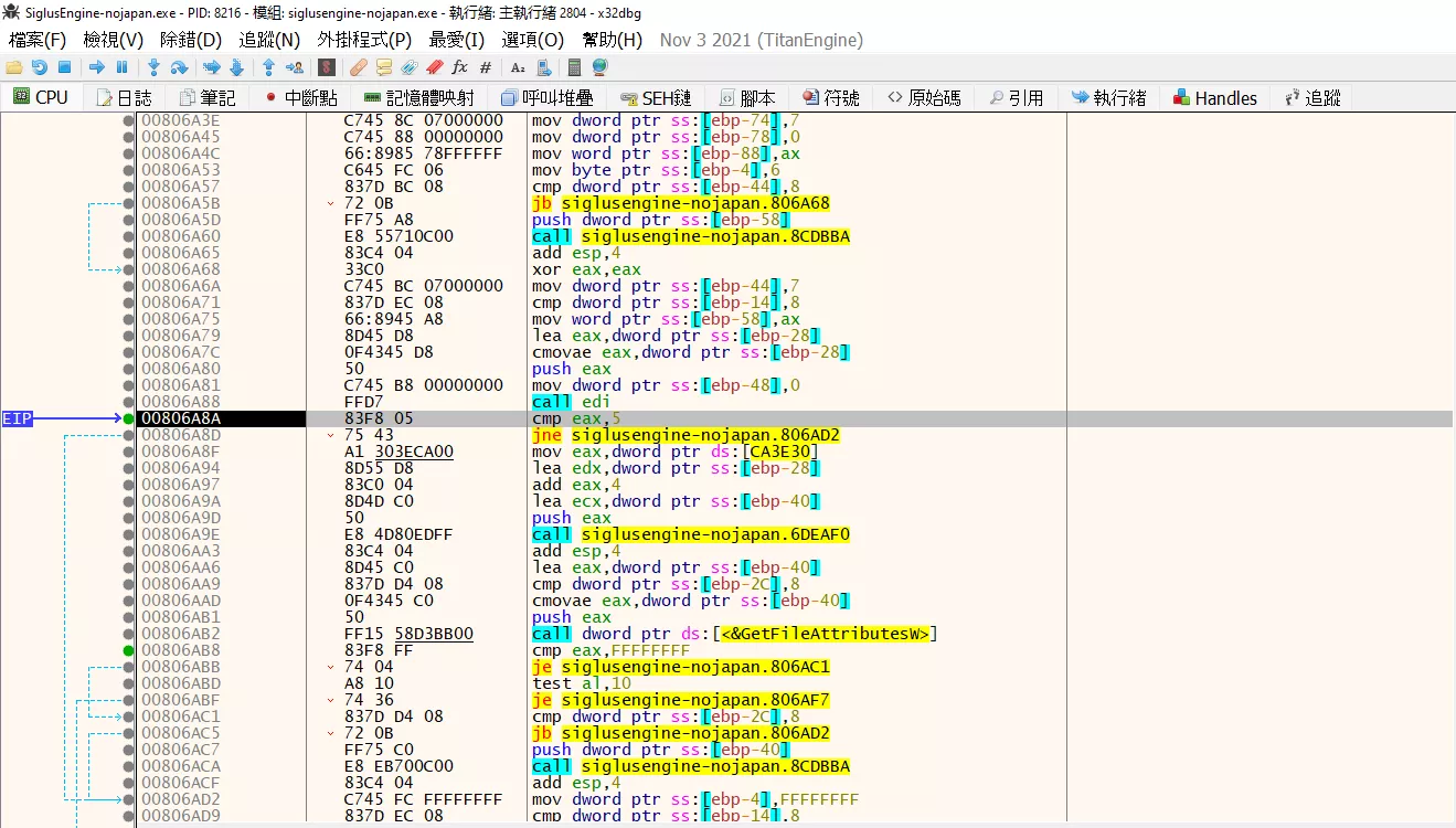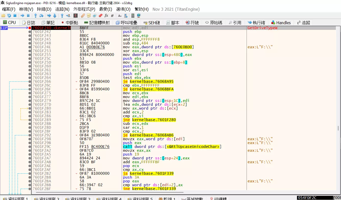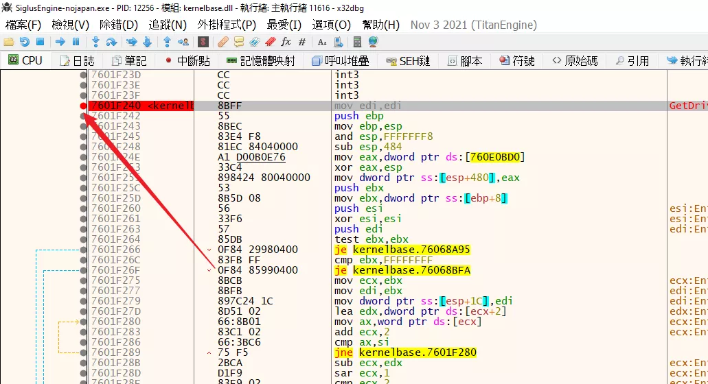 如果 Galgame 確實調用了 GetDriveType 的話,那麼在進行光盤驗證的時候將會自動暫停在紅色的地方。