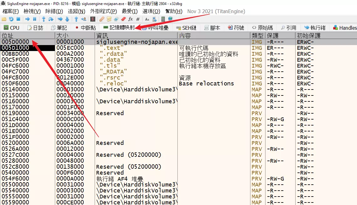 回到 x64dbg 中,點記憶體映射,然後在最上面可以看到,