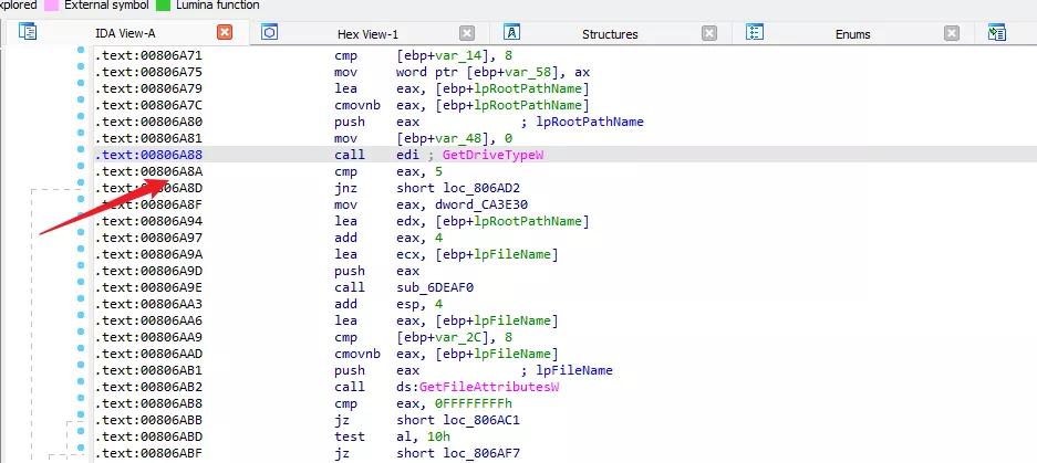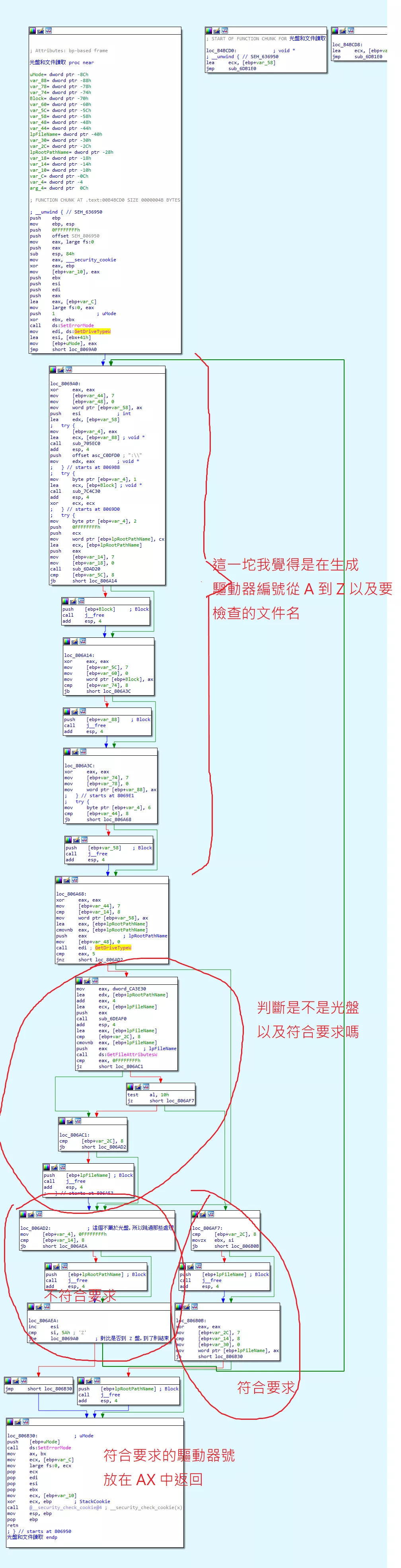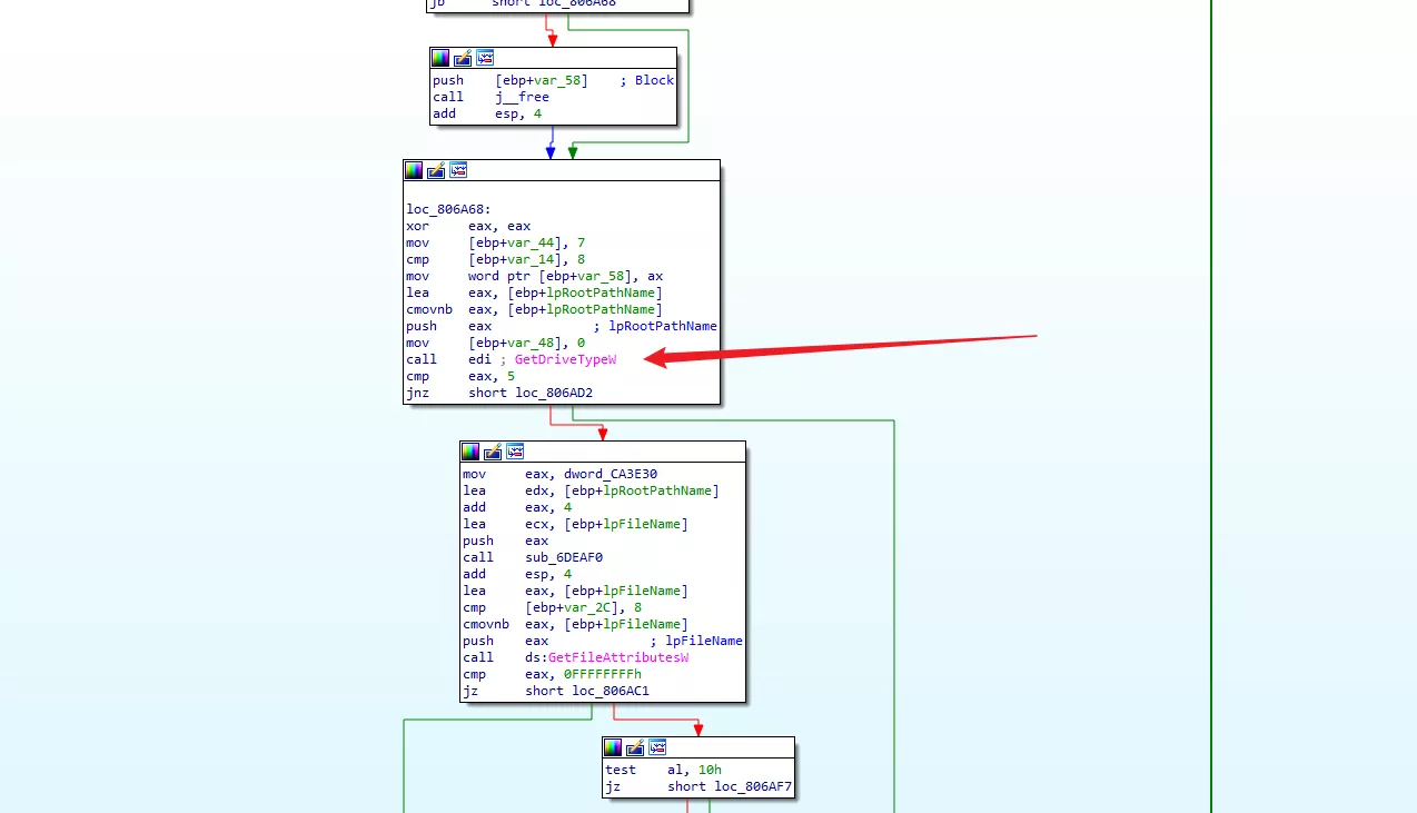 可以看到,在進行 GetDriveType 之後,根據結果不同程序分爲兩條路,