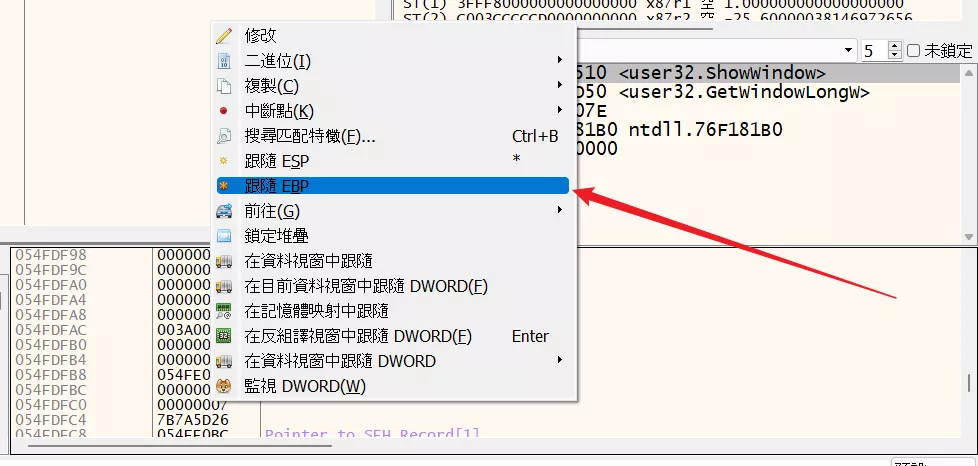 在堆棧窗口右鍵,然後跟隨 EBP(棧幀指針),可以看到目前堆棧的情況。