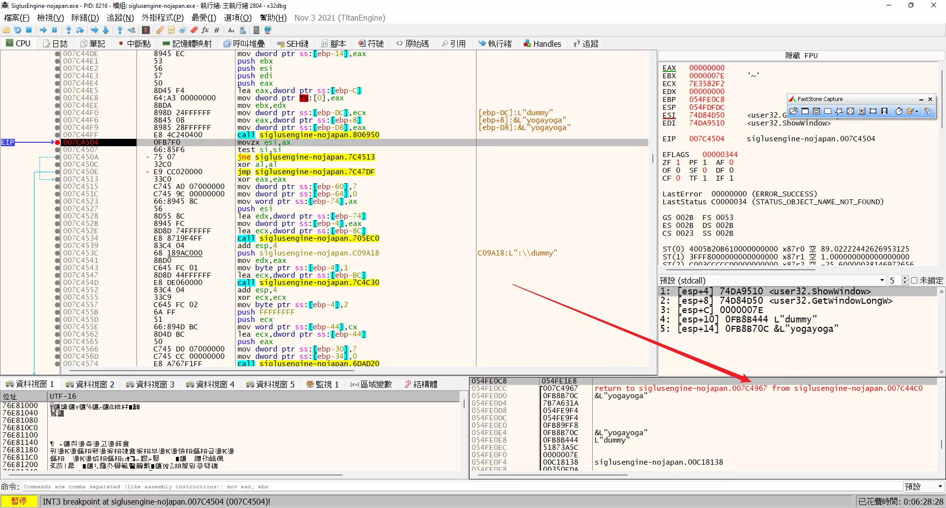 發現 dummy 測試完成后會返回 7C4967,在 IDA 打開這個地址。